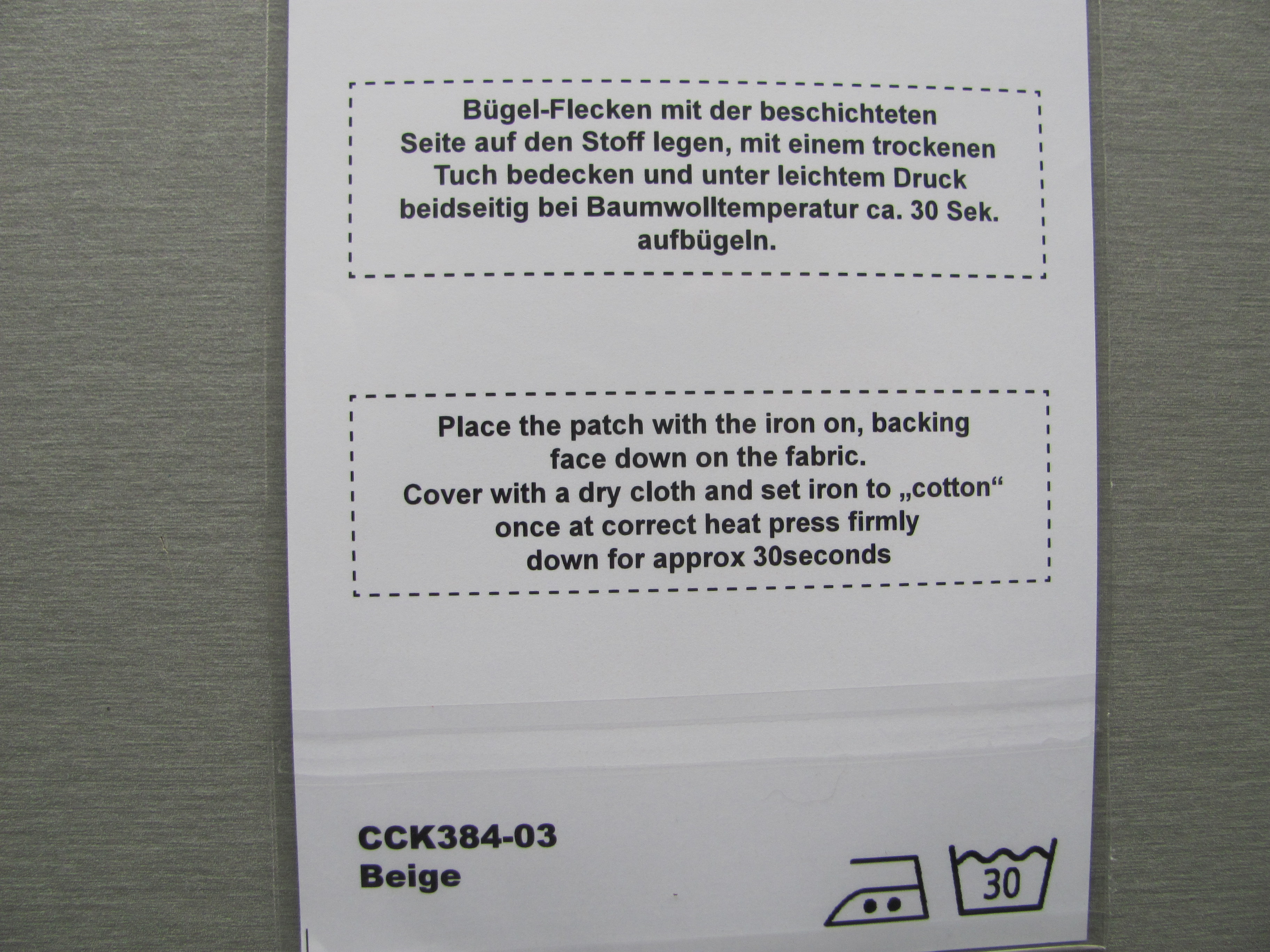 Návod k použití: Záplatu umístěte lesklou stranou na látku (nepoužívejte na umělé tkaniny). Položte ji na žehlicí prkno tak, aby byla záplata směrem dolů a na ni pokryjte látku. Pokud používáte napařovací žehličku, vypněte napařování. Přežehlte z rubové strany s větším tlakem po dobu 15–20 sekund. Nechte oděv vychladnout po dobu asi 15 minut. I přesto, že záplata drží pevně, doporučuje se ji přišít pro zvýšení pevnosti.