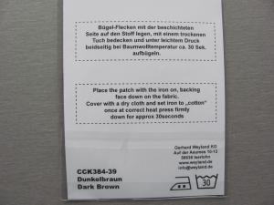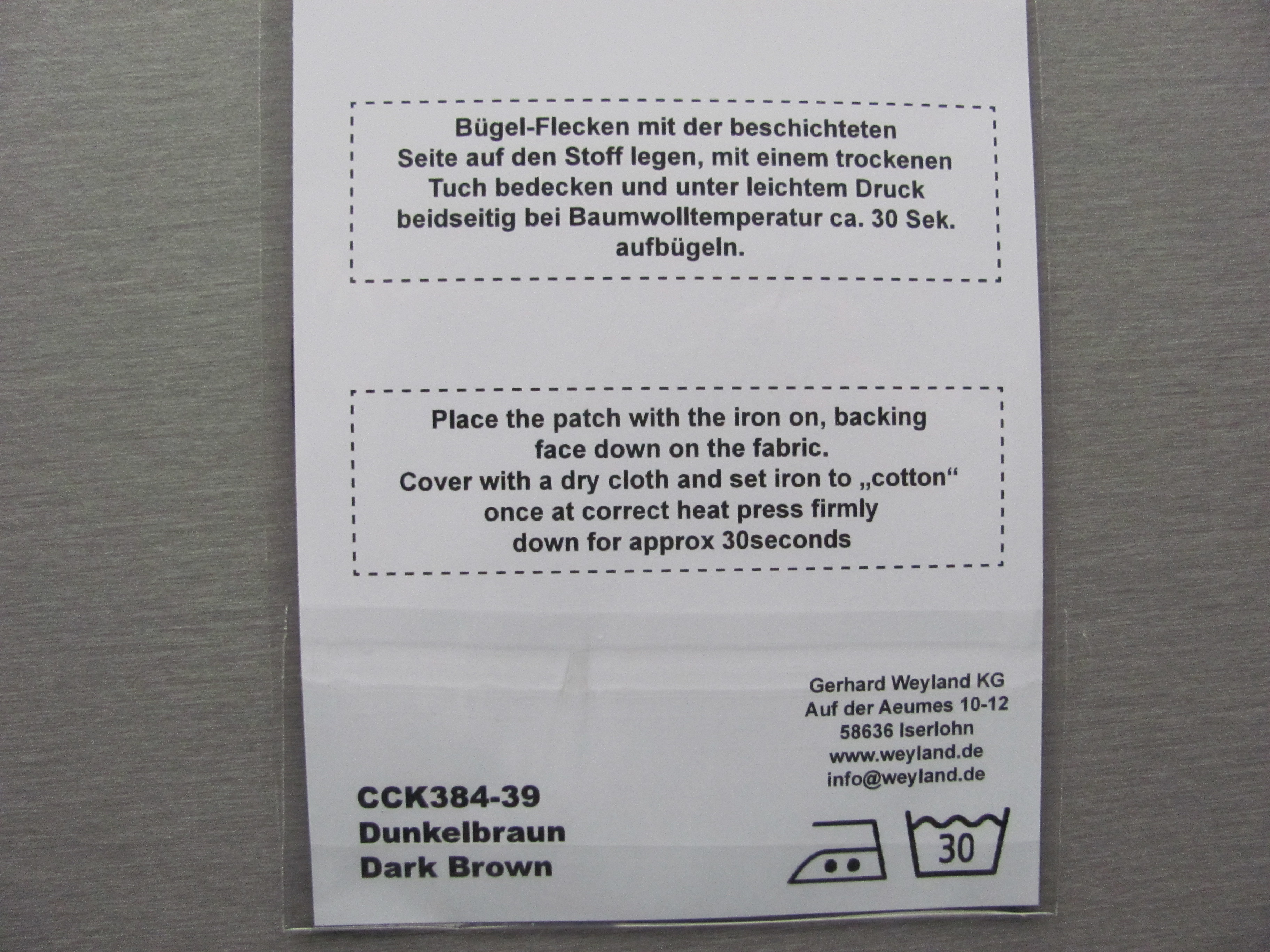 Návod k použití: Záplatu umístěte lesklou stranou na látku (nepoužívejte na umělé tkaniny). Položte ji na žehlicí prkno tak, aby byla záplata směrem dolů a na ni pokryjte látku. Pokud používáte napařovací žehličku, vypněte napařování. Přežehlte z rubové strany s větším tlakem po dobu 15–20 sekund. Nechte oděv vychladnout po dobu asi 15 minut. I přesto, že záplata drží pevně, doporučuje se ji přišít pro zvýšení pevnosti.